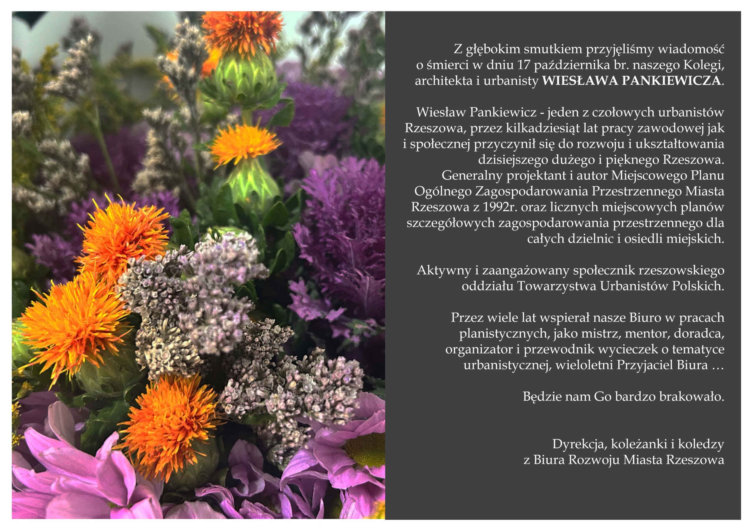 Z głębokim smutkiem przyjęliśmy wiadomość o śmierci w dniu 17 października br. naszego Kolegi, architekta i urbanisty WIESŁAWA PANKIEWICZA